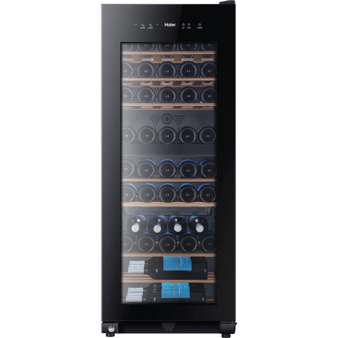 Housing up to an incredible 53 bottles, Haier’s top-performing wine cooler ensures that your collection of varied wines will all be ready for the moment you need them. Furthermore, thanks to its dual temperature zones, controlled independently, even wines requiring notably different storage conditions will sit comfortably within this cooler. Not only that, but its minimal black-fronted design draws your eyes right through the UV-protected glass to the well-lit bottles inside, giving it a good number of points for aesthetics and functionality – that really is the dream combination.