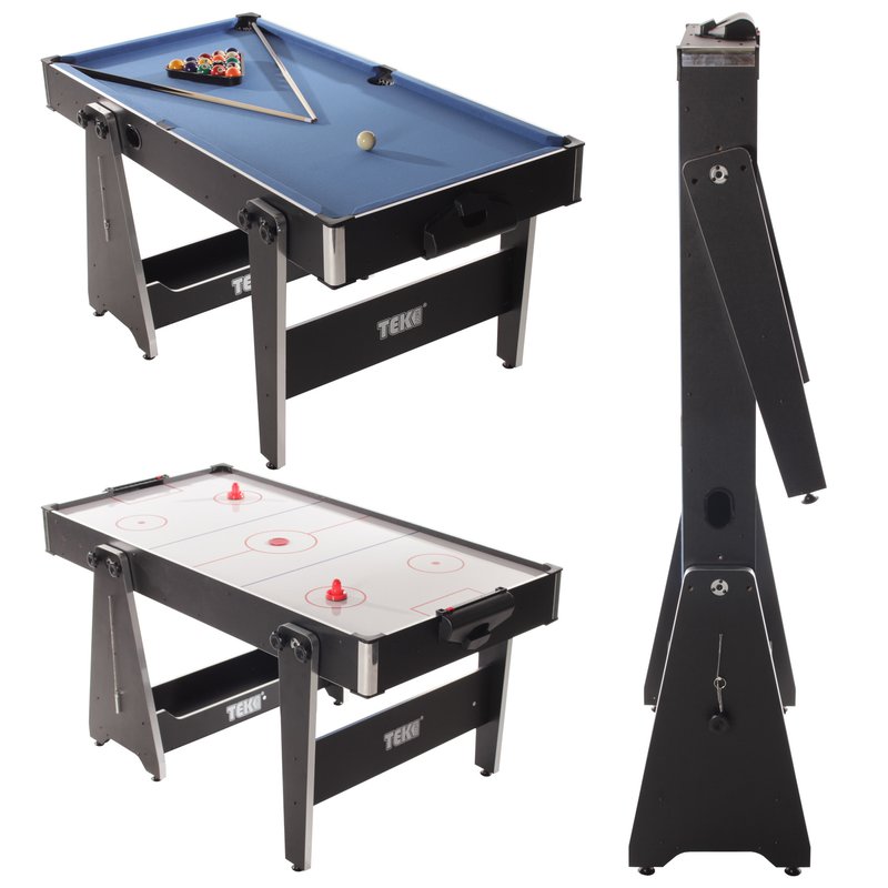 Next up, this awesome fold away pool table has two games in one, that’s both pool and air hockey, in a really clever reversible unit! We found it to be effortless swapping between games - it just needs to be simply rotated, and its innovative vertical storage means it can fold up even thinner than most, saving even more room when needed. If you're looking for something on the smaller side you're in luck as it's not too large at 5ft, but this does compromise the quality of gameplay when playing pool as the balls gather up in the same place quite easily. Remember that the air hockey does need to be plugged in to the mains, so make sure you have the right space for it. If we're being critical too, the strength of the air coming from the fan is a little on the weaker side and is likely to deteriorate over time, but we found that it's evenly spread across the surface which might feel like a minimum expectation but there's a wide range of quality in this department when it comes to air hockey tables so we're happy with it! Let’s face it, how great would it be to have an air hockey table at home. Again, this comes with a good amount of accessories and definitely those needed for a good game of air hockey and pool.