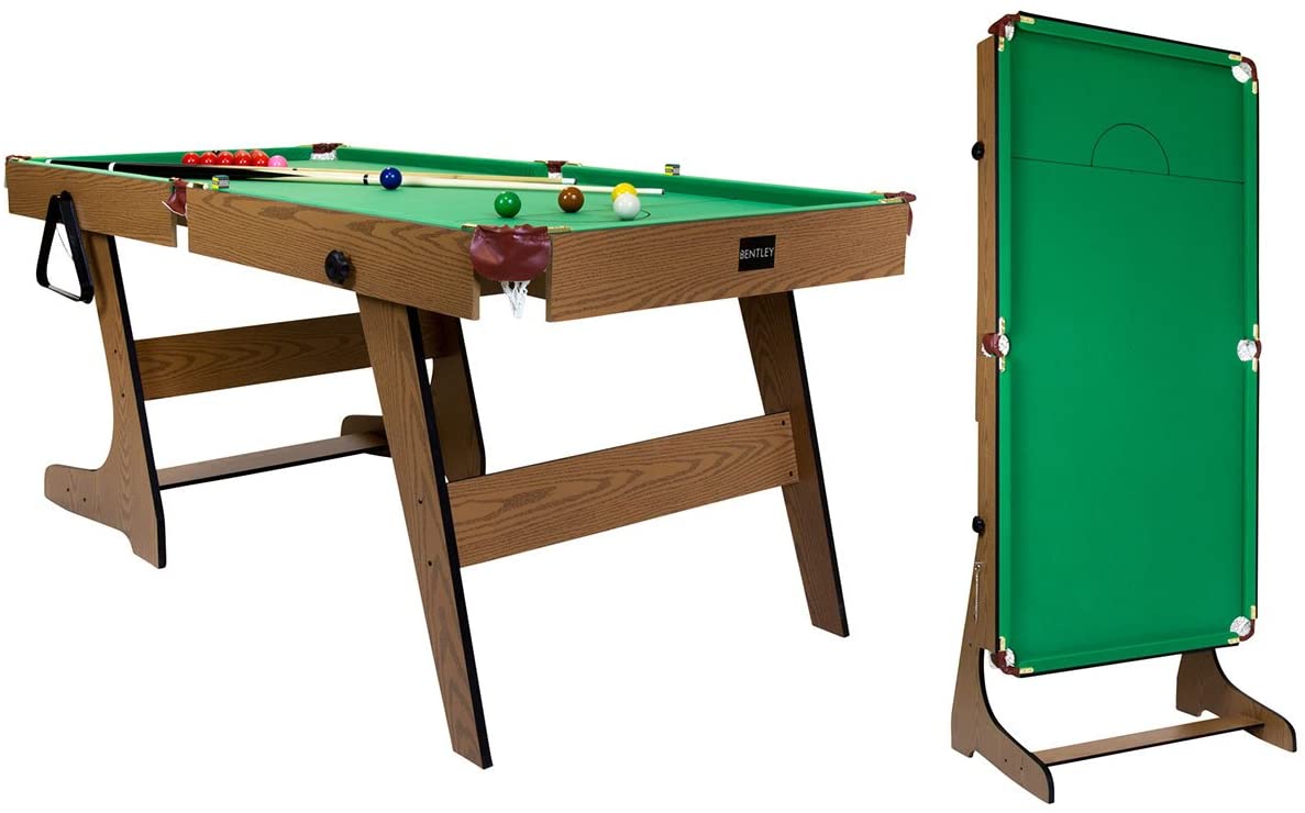 For its size and stature (it's on the bigger side) this pool table boasts good value for money, and is suited to the whole family as it's large enough for adults but robust and durable enough for younger players. We particularly like the aesthetic of this table, with the light brown wood and light green cloth, keeping things traditional. As with all of our folding pool tables this one folds up safely and securely for convenient storage, and can be kept vertical without the need to rest against a wall. The real benefits are its size, the fact that it comes with everything you need to get started right away (including 2 48" cues, snooker and pool balls, a triangle, and even a table brush), and its simple aesthetic. Unfortunately the gameplay does let it down a bit as the frame is made from engineered wood and not the preferred MDF - we didn't have any issues when giving this table a go, but over time this becomes a greater consideration with fears of wear and tear and the cloth coming away from the sides.