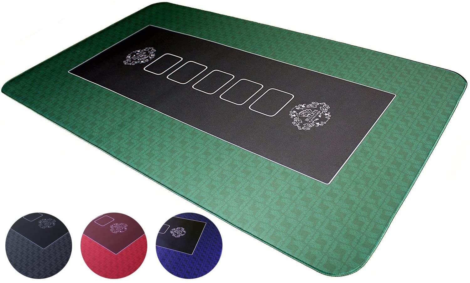 Our first poker table top mat in the list is this small mat that comes in a variety of colour options (green, black, red, blue) and is designed for a game of Texas Hold’em with the five card placeholders in the middle. It’s a great quality mat that gets fantastic reviews from customers, in part thanks to the smooth water-resistant surface and non-slip rubber underside. The mat conveniently rolls up into a box for easy storage.